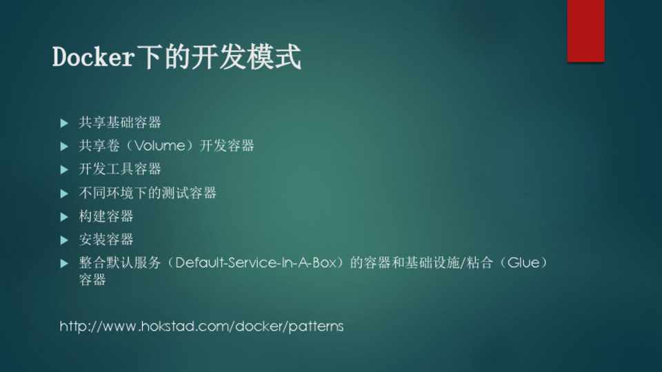 共享基础容器 共享卷(Volume)开发容器 开发工具容器 不同环境下的测试容器 构建容器 安装容器 整合默认服务(Default-Service-In-A-Box)的容器和基础设施/粘合(Glue)