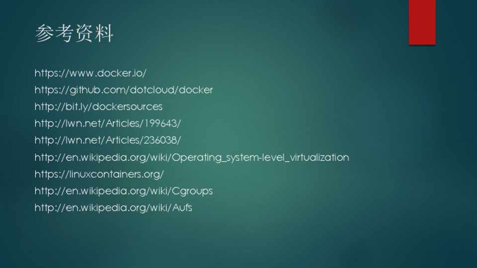 https://www.docker.io/ https://github.com/dotcloud/docker http://bit.ly/dockersources http://lwn.net/Articles/199643/ http://lwn.net/Articles/236038/ http://en.wikipedia.org/wiki/Operating_system-level_virtualization https://linuxcontainers.org/ http://en.wikipedia.org/wiki/Cgroups http://en.wikipedia.org/wiki/Aufs