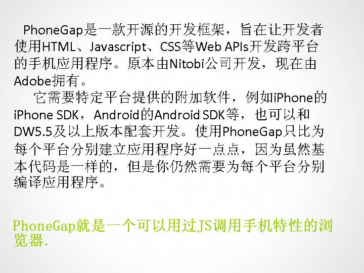 PhoneGap是一款开源的开发框架,旨在让开发者使用HTML、Javascript、CSS等Web APIs开发跨平台的手机应用程序。原本由Nitobi公司开发,现在由Adobe拥有。