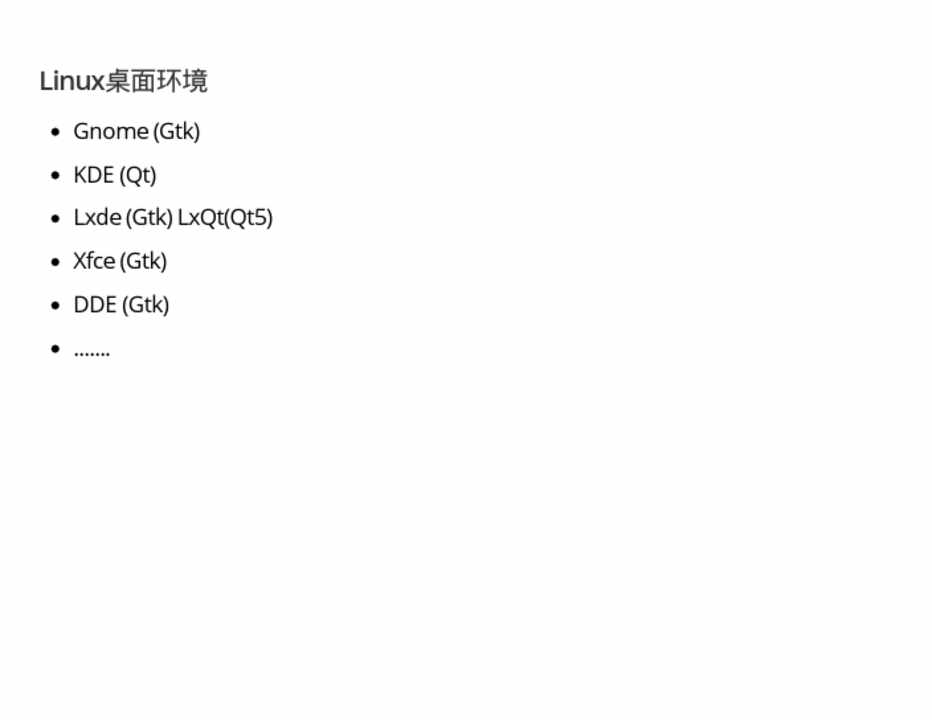 Gnome (Gtk) KDE (Qt) Lxde (Gtk) LxQt(Qt5) Xfce (Gtk) DDE (Gtk) .......