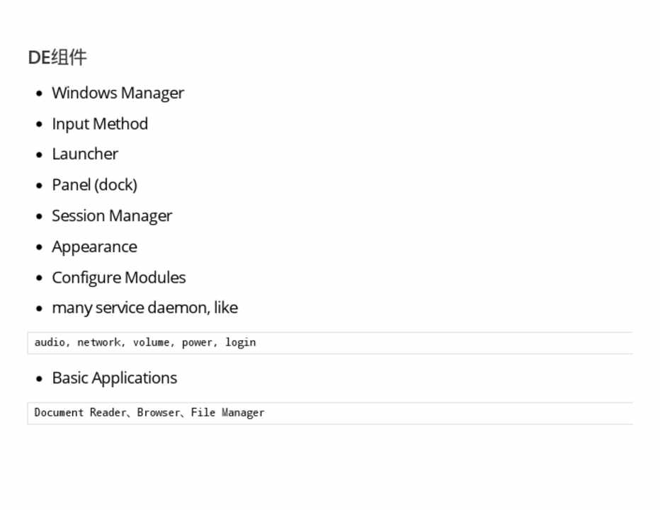 Windows Manager Input Method Launcher Panel (dock) Session Manager Appearance Configure Modules many service daemon, like