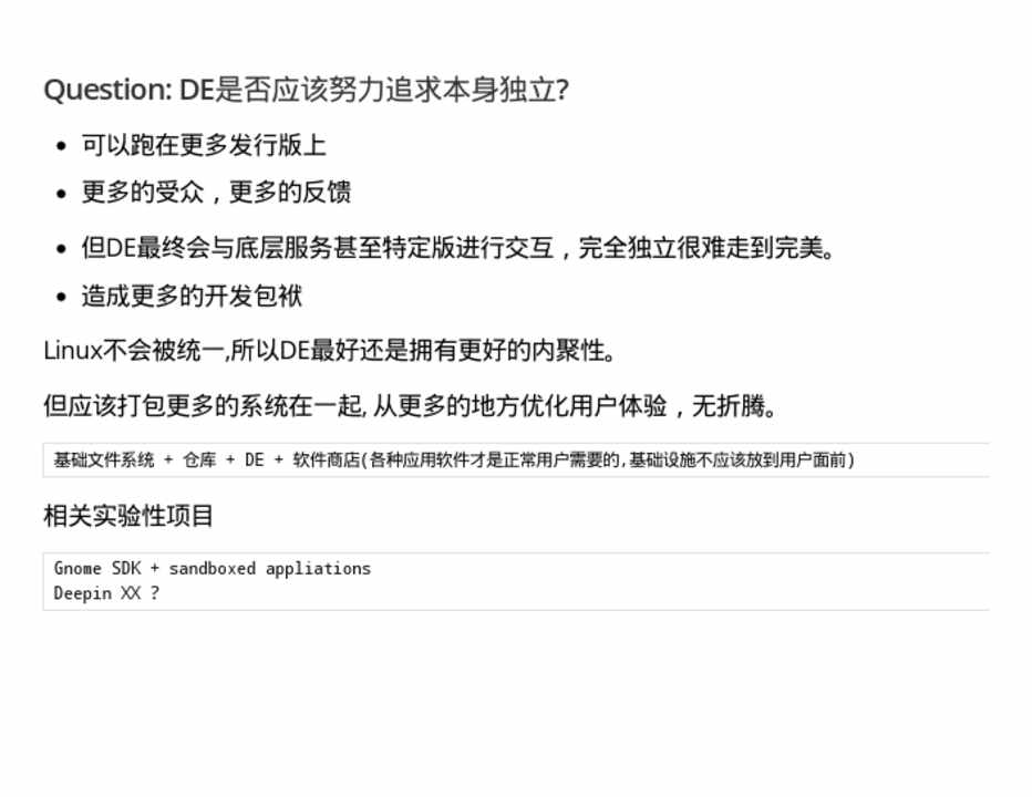 可以跑在更多发行版上 更多的受众,更多的反馈 但DE最终会与底层服务甚至特定版进行交互,完全独立很难走到完美。 造成更多的开发包袱 Linux不会被统一,所以DE最好还是拥有更好的内聚性。 但应该打包更多的系统在一起, 从更多的地方优化用户体验,无折腾。