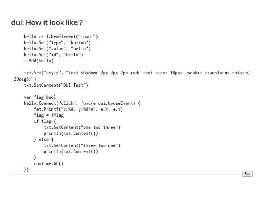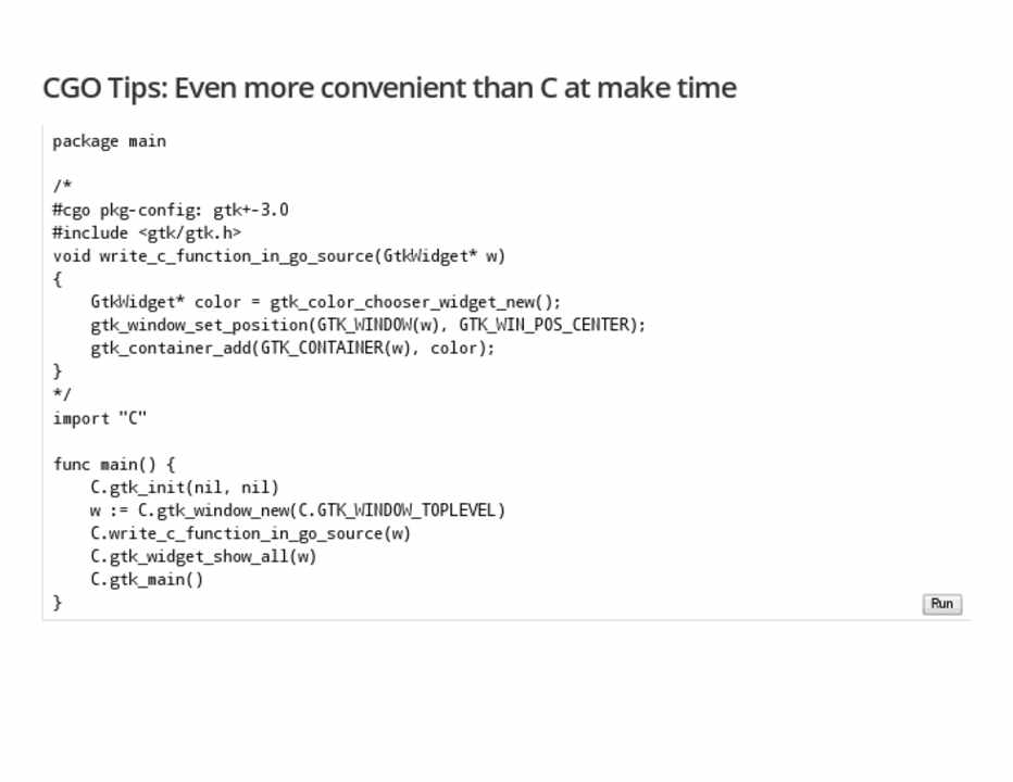 func main() { C.gtk_init(nil, nil) w := C.gtk_window_new(C.GTK_WINDOW_TOPLEVEL) C.write_c_function_in_go_source(w) C.gtk_widget_show_all(w) C.gtk_main()