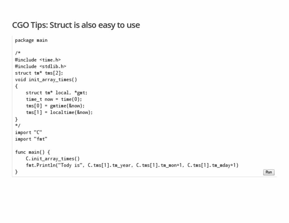func main() { C.init_array_times() fmt.Println("Tody is", C.tms[1].tm_year, C.tms[1].tm_mon+1, C.tms[1].tm_mday+1)
