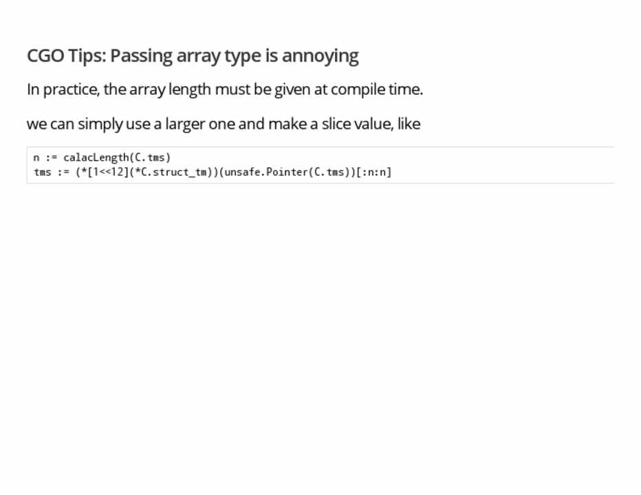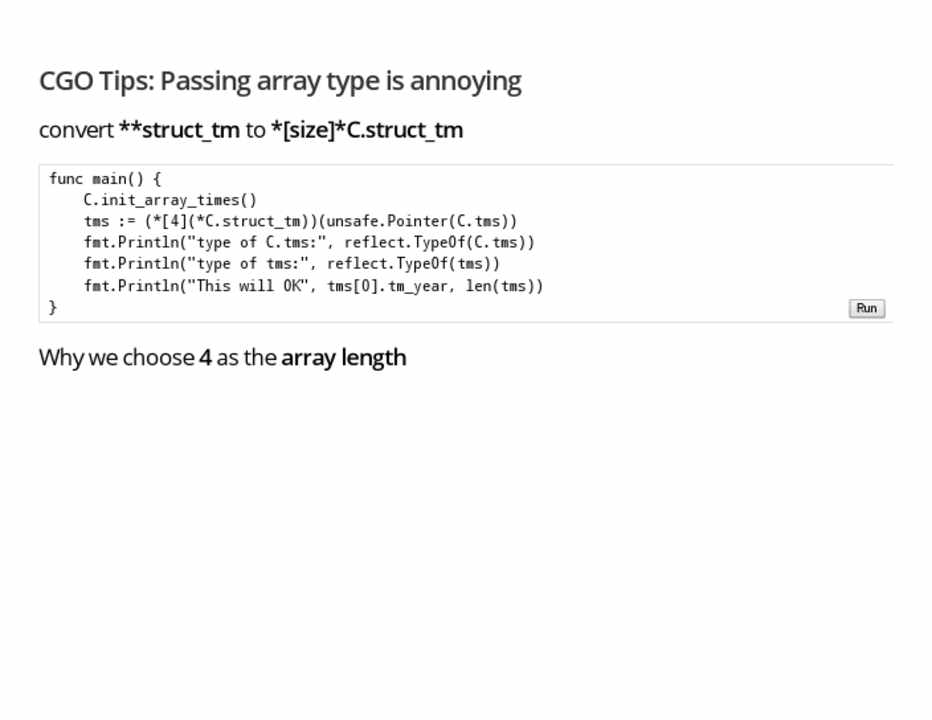 func main() { C.init_array_times() tms := (*[4](*C.struct_tm))(unsafe.Pointer(C.tms)) fmt.Println("type of C.tms:", reflect.TypeOf(C.tms)) fmt.Println("type of tms:", reflect.TypeOf(tms)) fmt.Println("This will OK", tms[0].tm_year, len(tms))