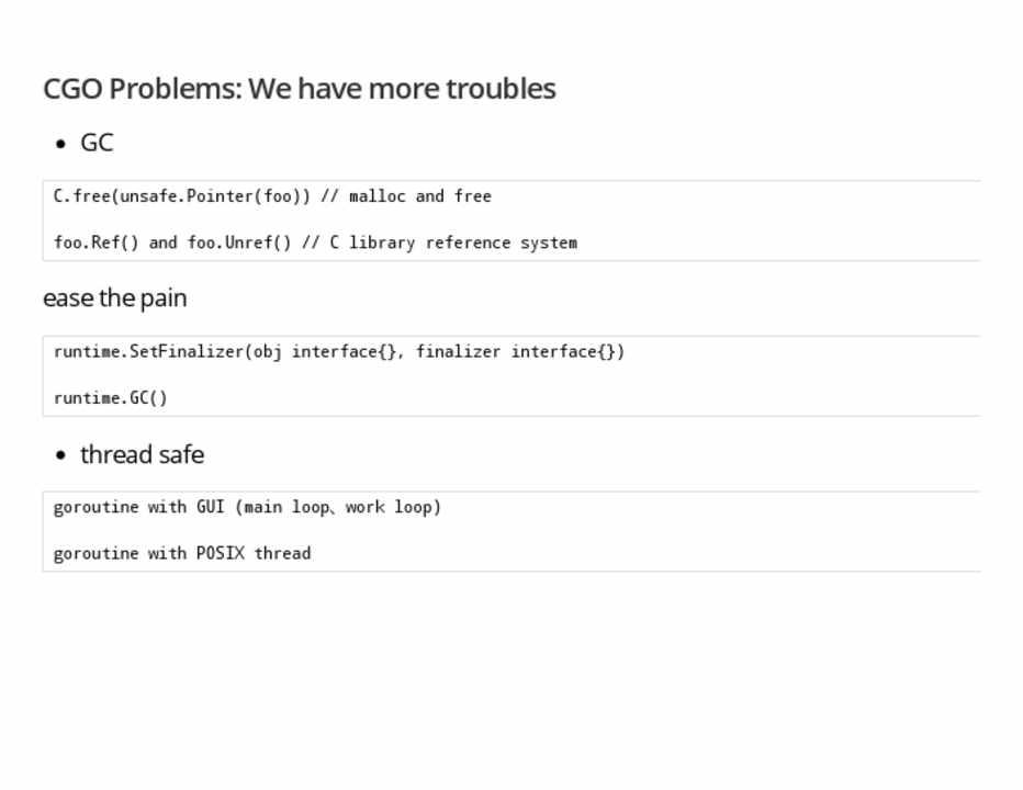 C.free(unsafe.Pointer(foo)) // malloc and free foo.Ref() and foo.Unref() // C library reference system