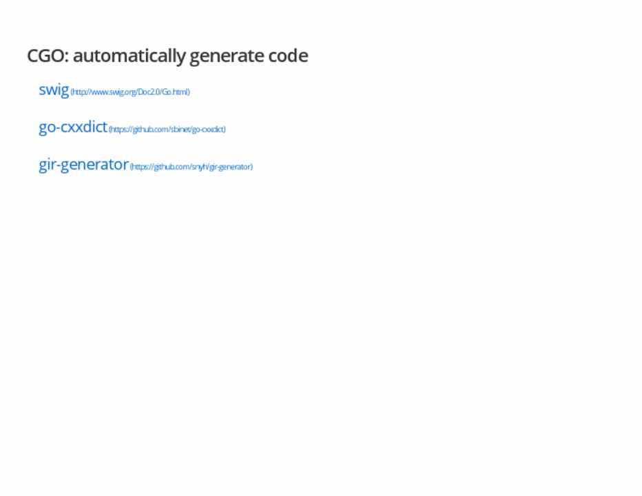 swig (http://www.swig.org/Doc2.0/Go.html) go-cxxdict (https://github.com/sbinet/go-cxxdict) gir-generator (https://github.com/snyh/gir-generator)