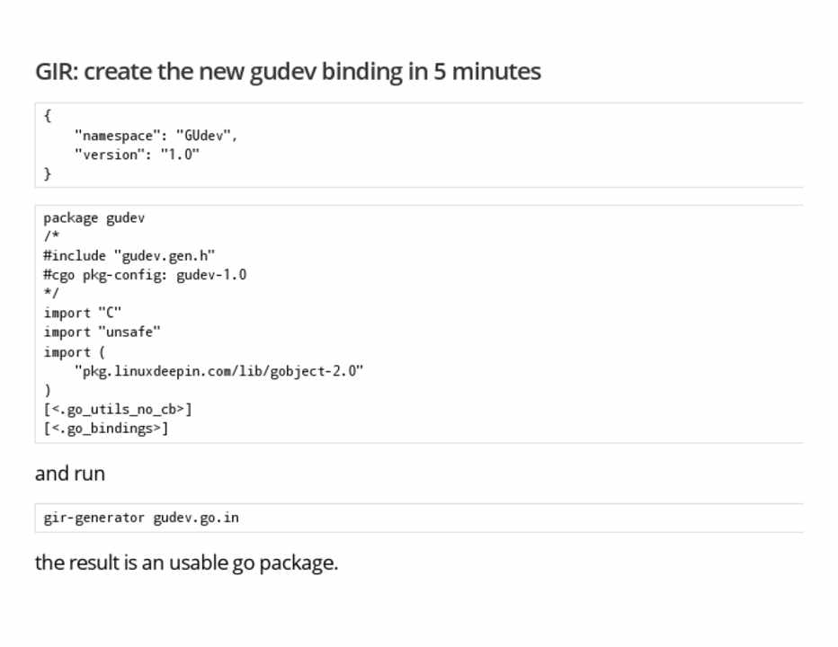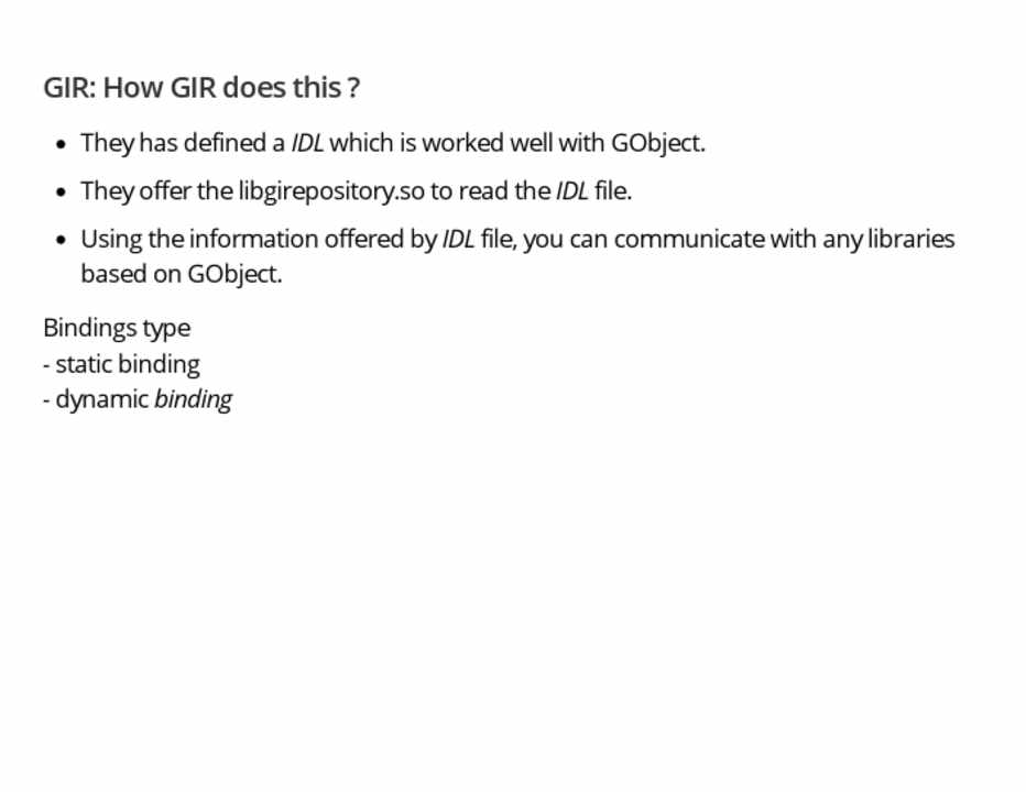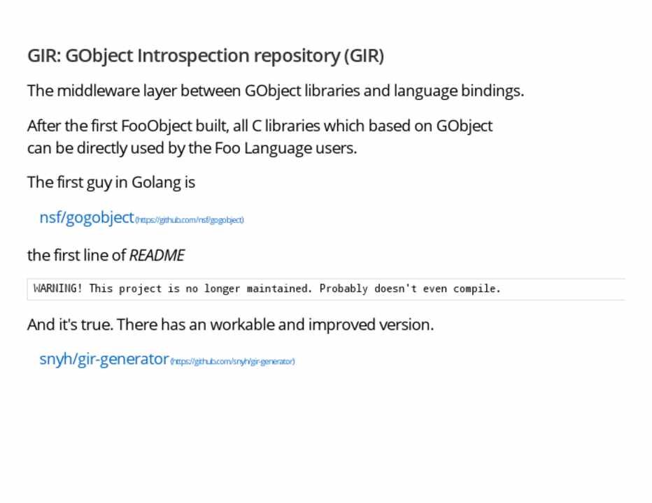 The middleware layer between GObject libraries and language bindings. After the first FooObject built, all C libraries which based on GObject can be directly used by the Foo Language users. The first guy in Golang is