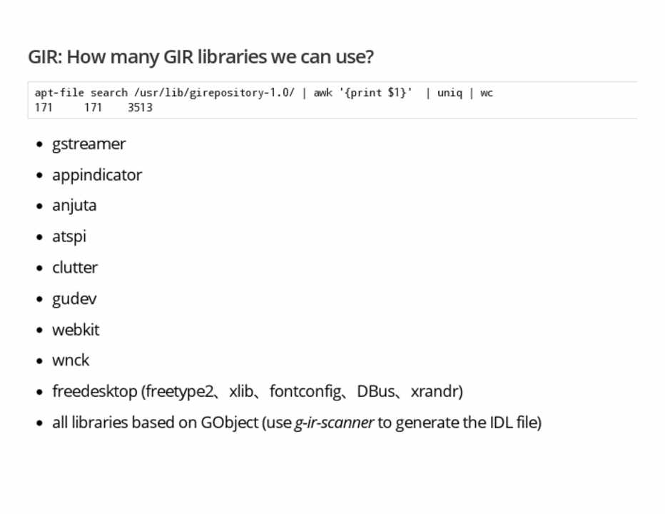 gstreamer appindicator anjuta atspi clutter gudev webkit wnck freedesktop (freetype2、xlib、fontconfig、DBus、xrandr) all libraries based on GObject (use g-ir-scanner to generate the IDL file)