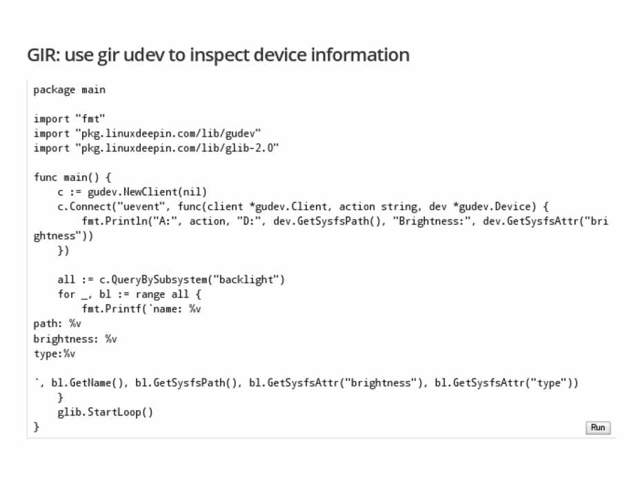 func main() { c := gudev.NewClient(nil) c.Connect("uevent", func(client *gudev.Client, action string, dev *gudev.Device) { fmt.Println("A:", action, "D:", dev.GetSysfsPath(), "Brightness:", dev.GetSysfsAttr("bri