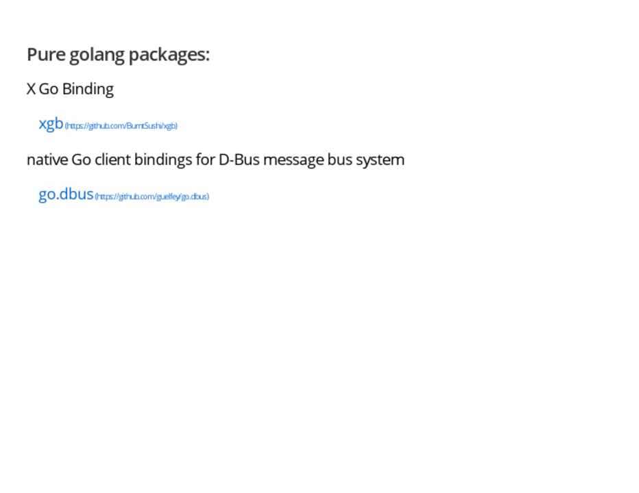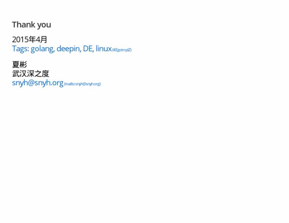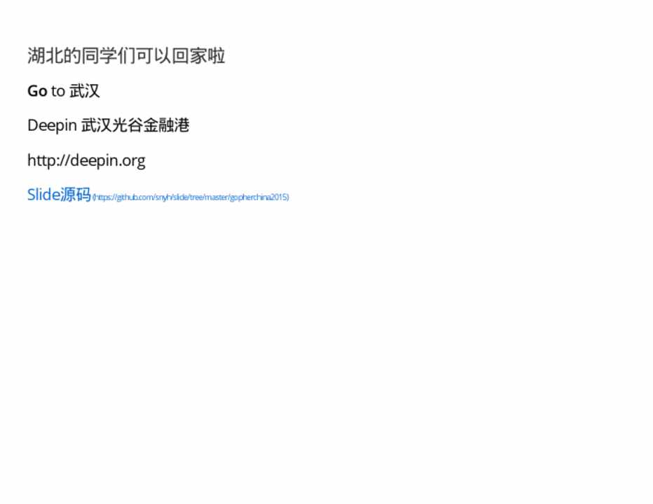 Go to 武汉 Deepin 武汉光谷金融港 http://deepin.org Slide源码 (https://github.com/snyh/slide/tree/master/gopherchina2015)