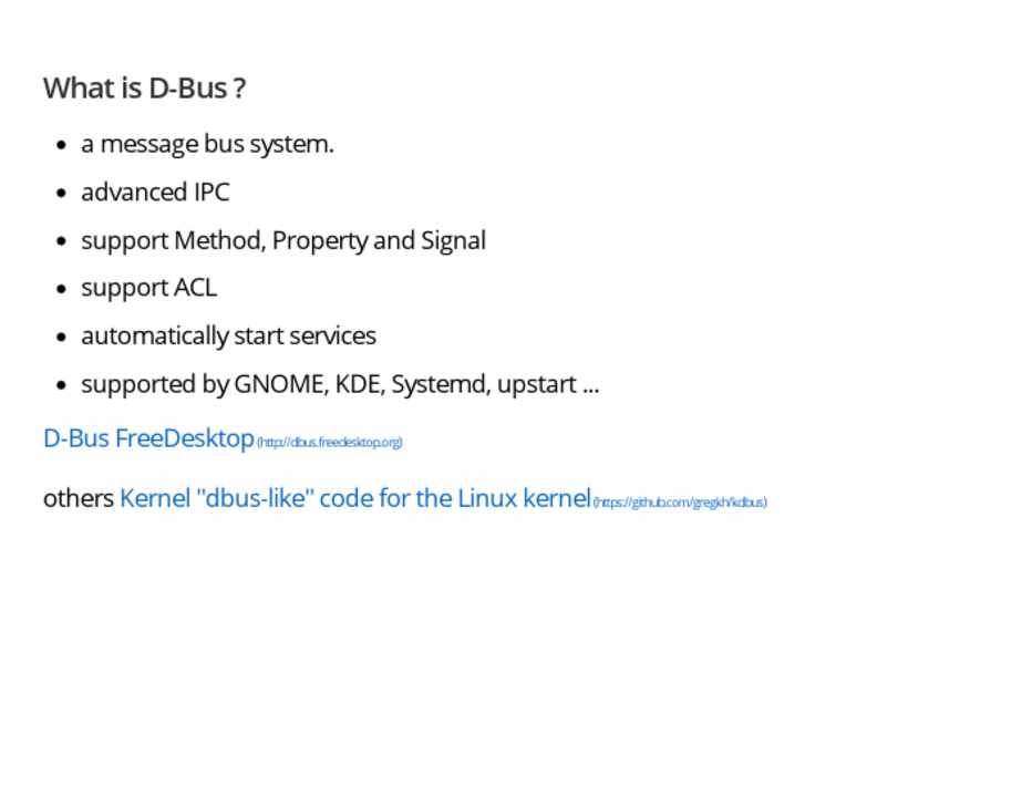a message bus system. advanced IPC support Method, Property and Signal support ACL automatically start services supported by GNOME, KDE, Systemd, upstart ... D-Bus FreeDesktop(http://dbus.freedesktop.org)