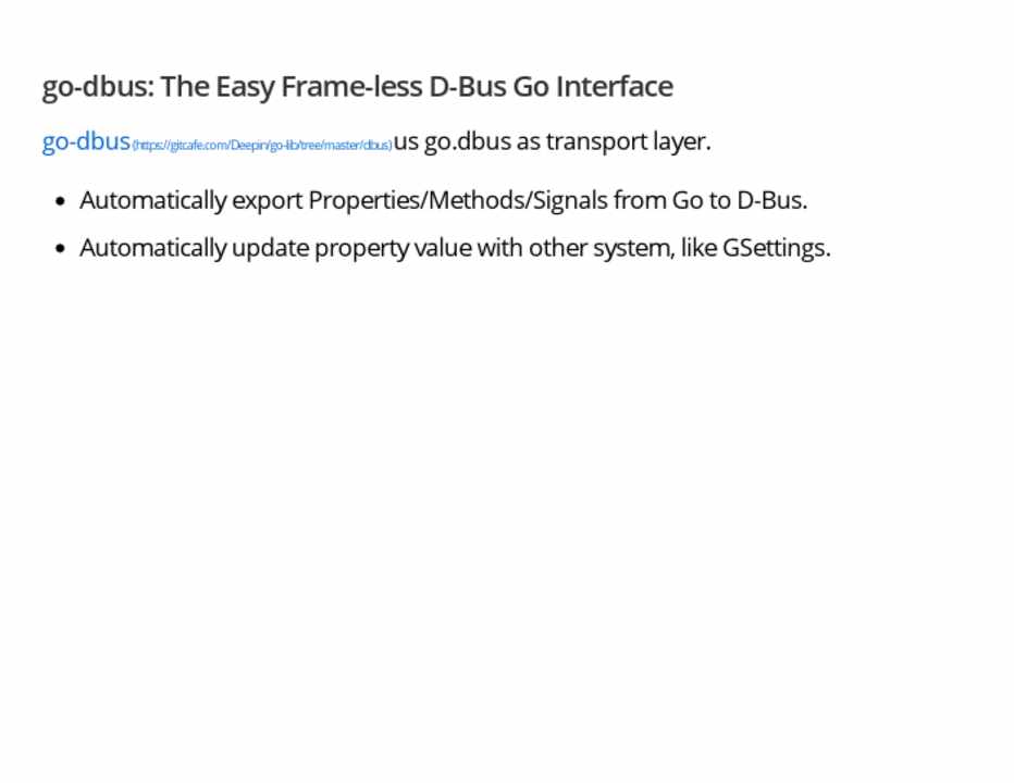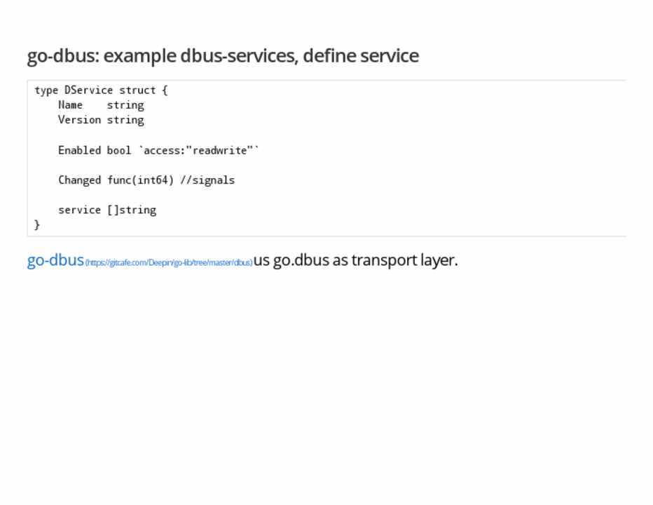 go-dbus us(https://gitcafe.com/Deepin/go-lib/tree/master/dbus) go.dbus as transport layer.