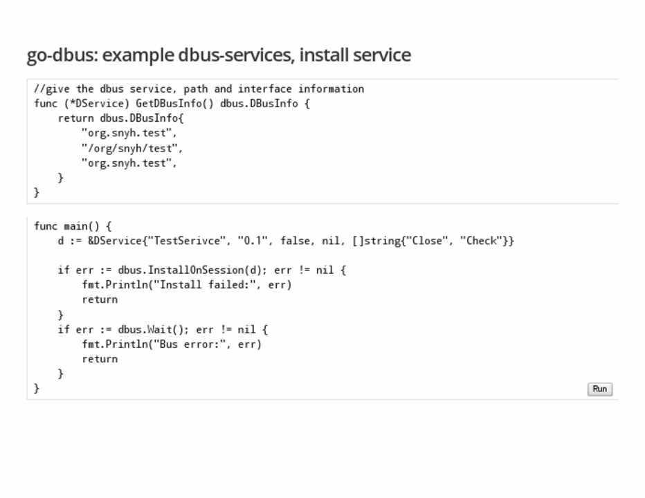 if err := dbus.InstallOnSession(d); err != nil { fmt.Println("Install failed:", err) return