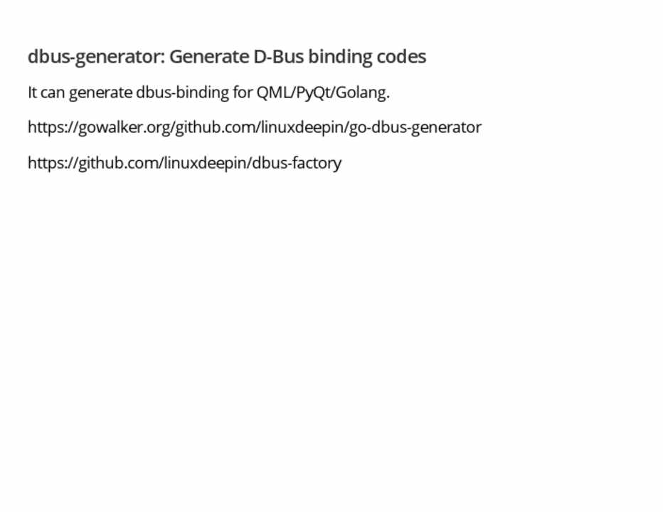 It can generate dbus-binding for QML/PyQt/Golang. https://gowalker.org/github.com/linuxdeepin/go-dbus-generator https://github.com/linuxdeepin/dbus-factory