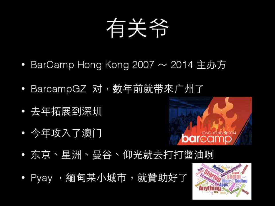 • BarCamp Hong Kong 2007 ~ 2014 主办⽅方 • BarcampGZ 对,数年前就带來⼲⼴广州了 • 去年拓展到深圳 • 今年攻⼊入了澳门 • 东京、星洲、曼⾕谷、仰光就去打打醬油咧 • Pyay ,緬甸某⼩小城市,就贊助好了