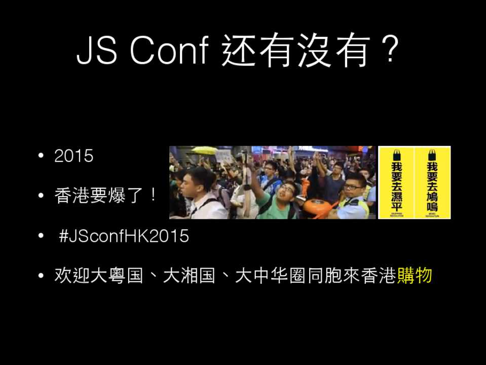 • 2015 • ⾹香港要爆了! • #JSconfHK2015 • 欢迎⼤大粵国、⼤大湘国、⼤大中华圈同胞來⾹香港購物