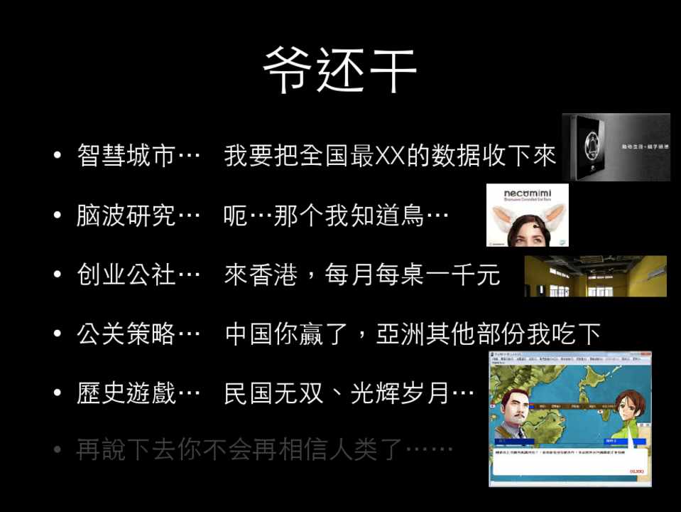 • 智彗城市⋯ 我要把全国最XX的数据收下來 • 脑波研究⋯ 呃⋯那个我知道⿃鳥⋯ • 创业公社⋯ 來⾹香港,每⽉月每桌⼀一千元 • 公关策略⋯ 中国你贏了,亞洲其他部份我吃下 • 歷史遊戲⋯ ⺠民国⽆无双、光辉岁⽉月⋯ • 再說下去你不会再相信⼈人类了⋯⋯