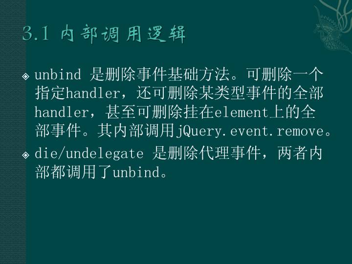 unbind 是删除事件基础方法。可删除一个指定handler,还可删除某类型事件的全部handler,甚至可删除挂在element上的全部事件。其内部调用jQuery.event.remove。