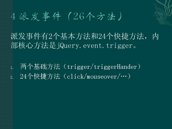 派发事件有2个基本方法和24个快捷方法,内部核心方法是jQuery.event.trigger。