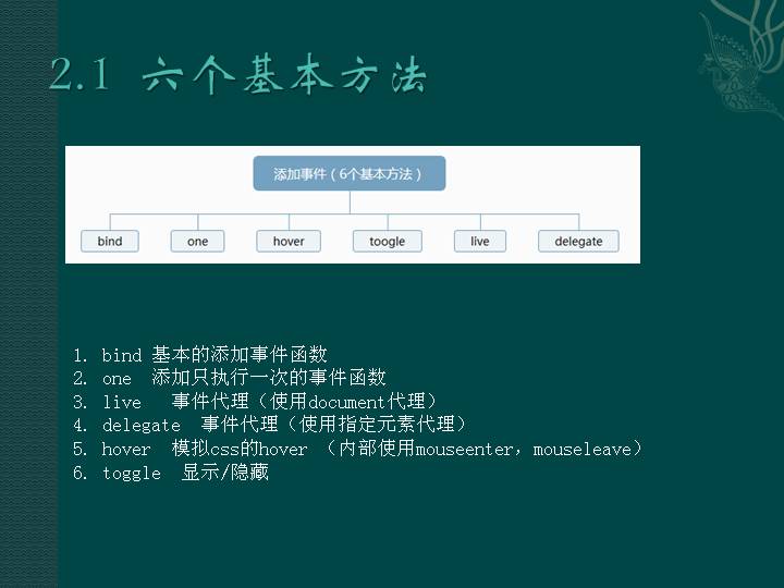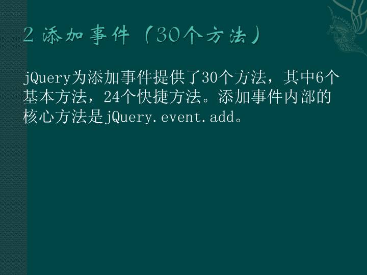 jQuery为添加事件提供了30个方法,其中6个基本方法,24个快捷方法。添加事件内部的核心方法是jQuery.event.add。