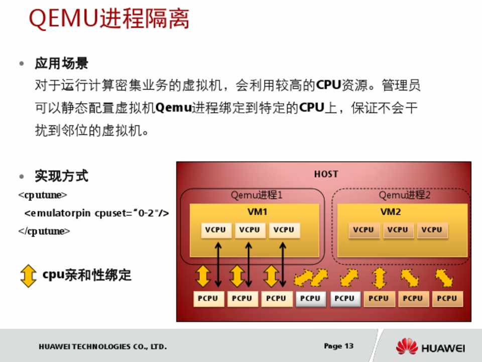 应用场景 对于运行计算密集业务的虚拟机,会利用较高的CPU资源。管理员 可以静态配置虚拟机Qemu进程绑定到特定的CPU上,保证不会干 扰到邻位的虚拟机。