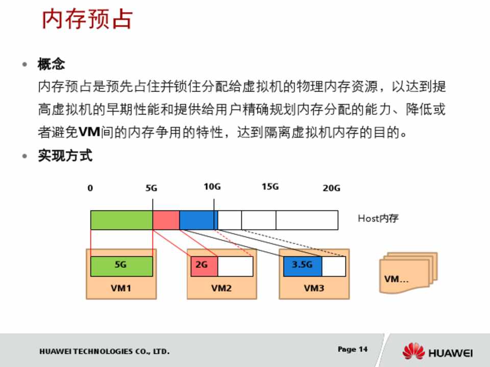 概念 内存预占是预先占住并锁住分配给虚拟机的物理内存资源,以达到提 高虚拟机的早期性能和提供给用户精确规划内存分配的能力、降低或 者避免VM间的内存争用的特性,达到隔离虚拟机内存的目的。