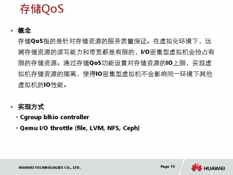 实现方式 - Cgroup blkio controller - Qemu I/O throttle (file, LVM, NFS, Ceph)