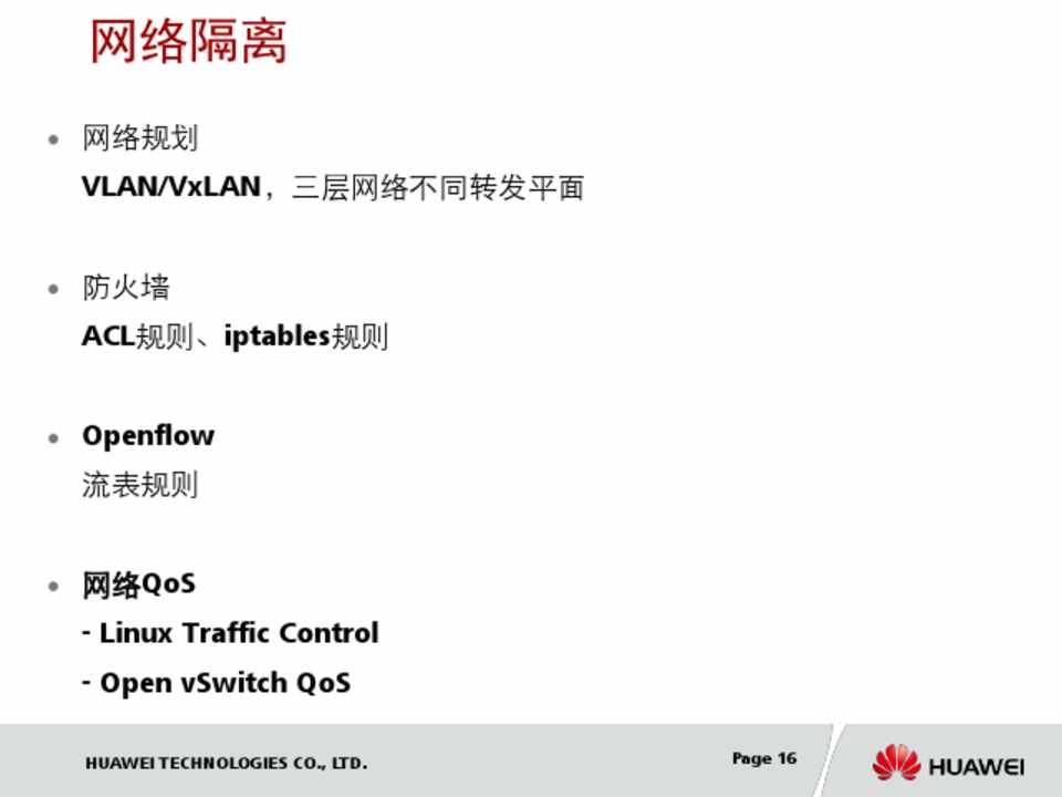 4、网络资源隔离 使用VLAN/VXLAN、ACL、 Openflow流表规则或不同的转 发平面设置,网络QoS