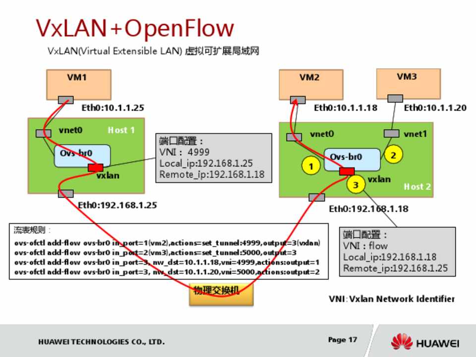 ovs-ofctl add-flow ovs-br0 in_port=1(vm2),actions=set_tunnel:4999,output=3(vxlan) ovs-ofctl add-flow ovs-br0 in_port=2(vm3),actions=set_tunnel:5000,output=3 ovs-ofctl add-flow ovs-br0 in_port=3, nw_dst=10.1.1.18,vni=4999,actions:output=1 ovs-ofctl add-flow ovs-br0 in_port=3, nw_dst=10.1.1.20,vni=5000,actions:output=2