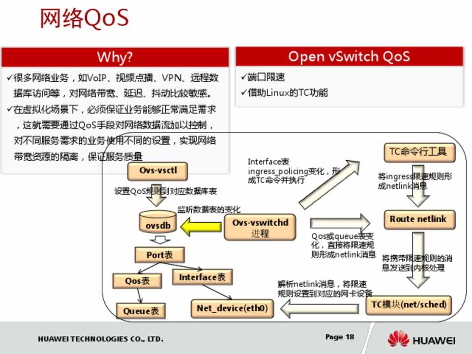 在虚拟化场景下,必须保证业务能够正常满足需求 ,这就需要通过QoS手段对网络数据流加以控制, 对不同服务需求的业务使用不同的设置,实现网络 带宽资源的隔离,保证服务质量 Ovs-vsctl