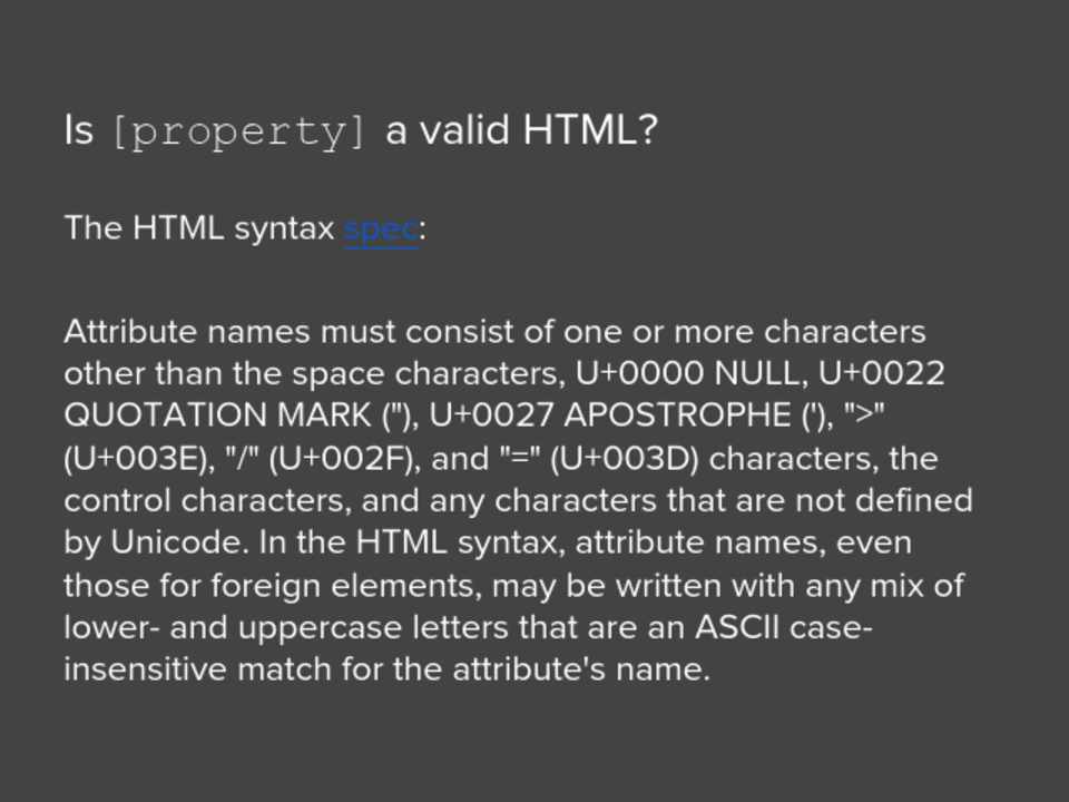 Attribute names must consist of one or more characters other than the space characters, U+0000 NULL, U+0022 QUOTATION MARK ("), U+0027 APOSTROPHE ('), ">" (U+003E), "/" (U+002F), and "=" (U+003D) characters, the control characters, and any characters that are not defined by Unicode. In the HTML syntax, attribute names, even those for foreign elements, may be written with any mix of lower- and uppercase letters that are an ASCII caseinsensitive match for the attribute's name.