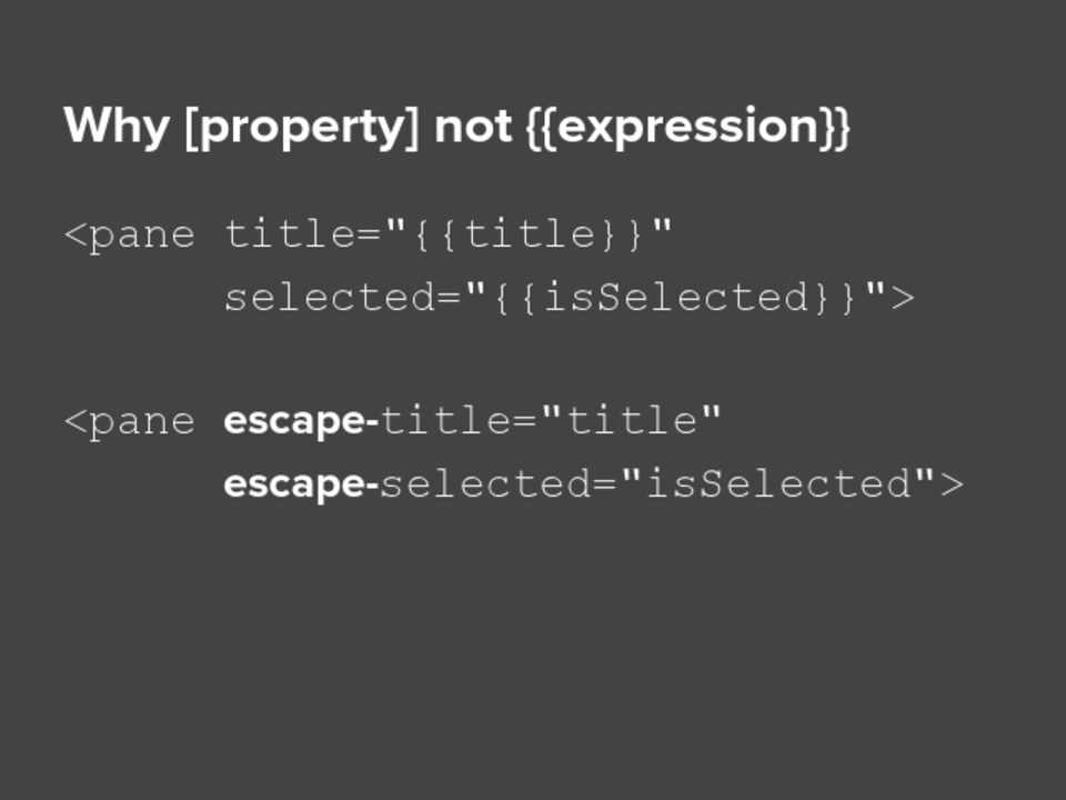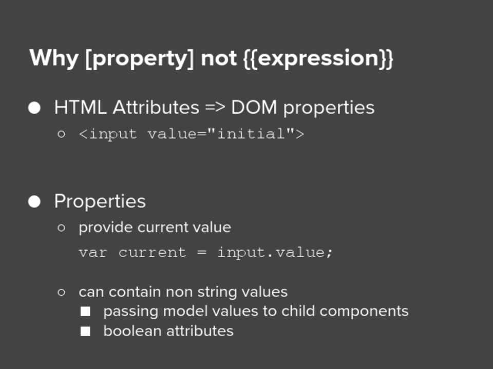 ○ can contain non string values ■ passing model values to child components ■ boolean attributes