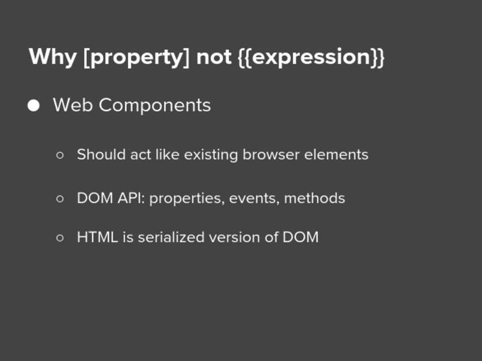 ○ Should act like existing browser elements ○ DOM API: properties, events, methods ○ HTML is serialized version of DOM