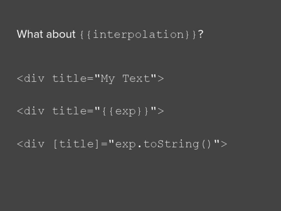 <div title="My Text"> <div title="{{exp}}"> <div [title]="exp.toString()">