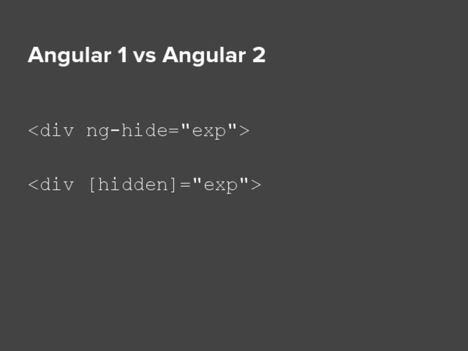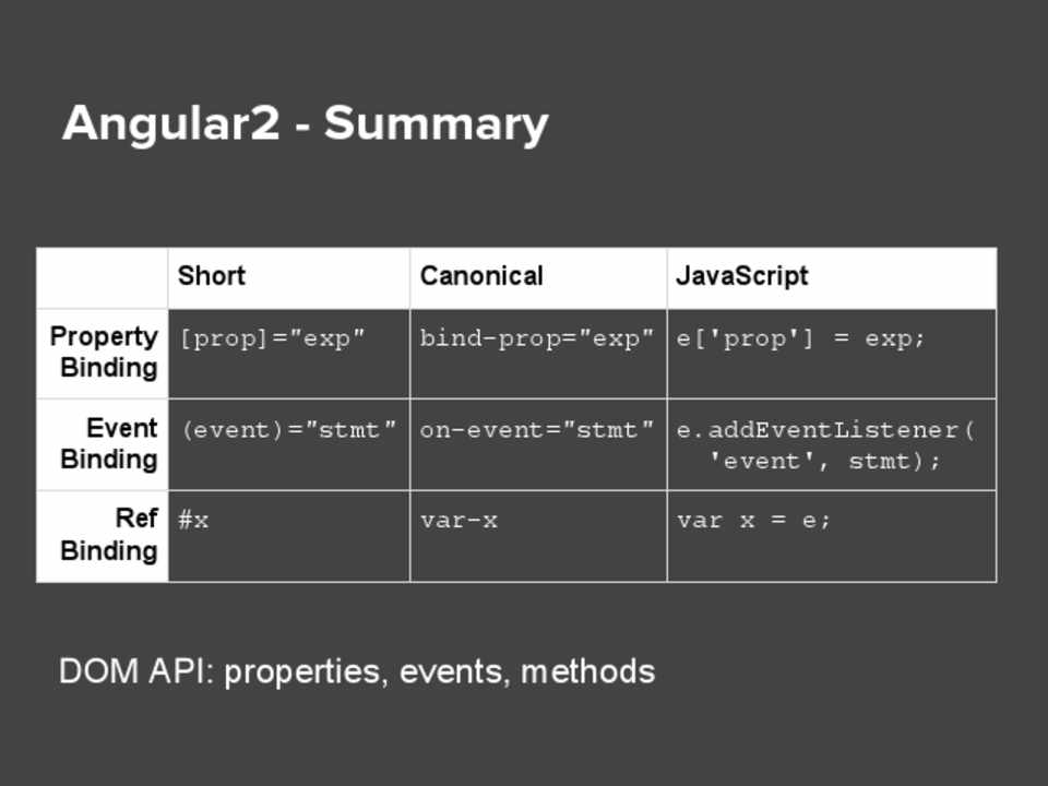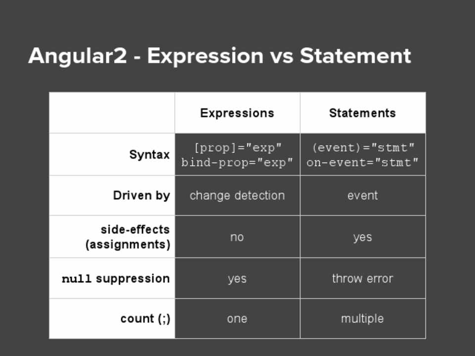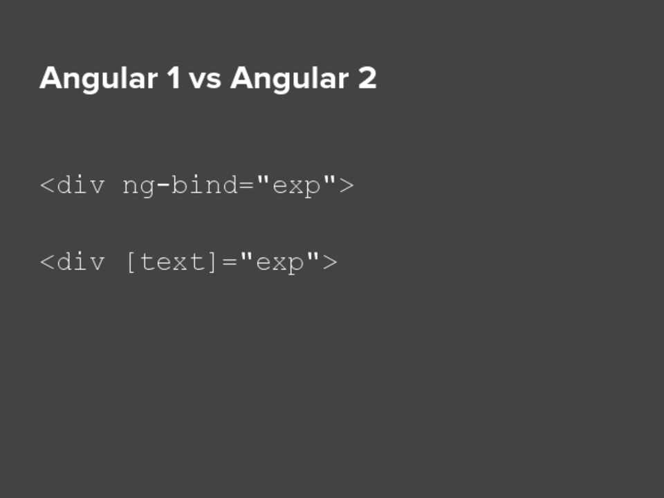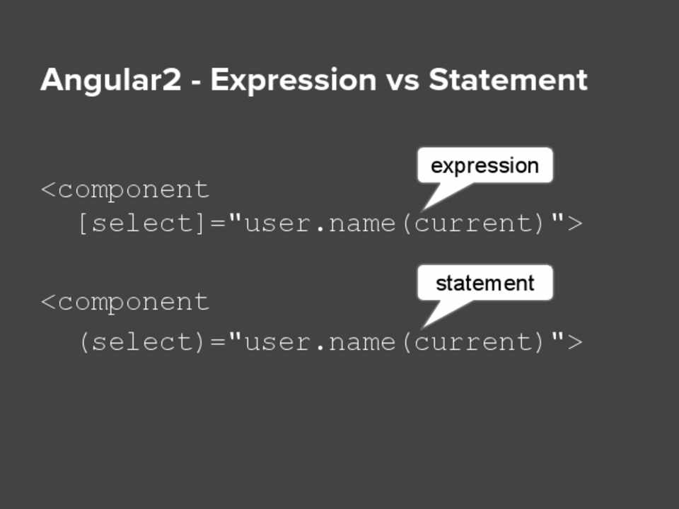 Syntax [prop]="exp" (event)="stmt" bind-prop="exp" on-event="stmt"