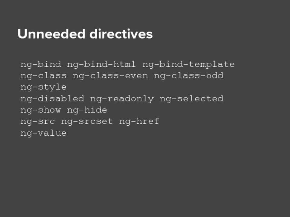 ng-bind ng-bind-html ng-bind-template ng-class ng-class-even ng-class-odd ng-style ng-disabled ng-readonly ng-selected ng-show ng-hide ng-src ng-srcset ng-href ng-value