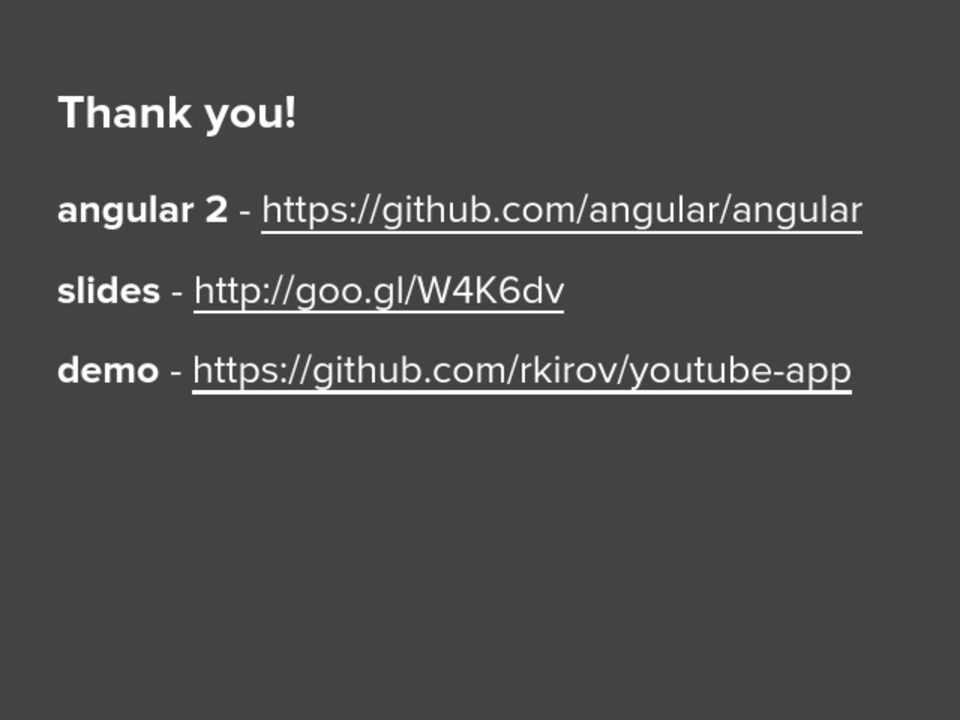 angular 2 - https://github.com/angular/angular slides - http://goo.gl/W4K6dv demo - https://github.com/rkirov/youtube-app