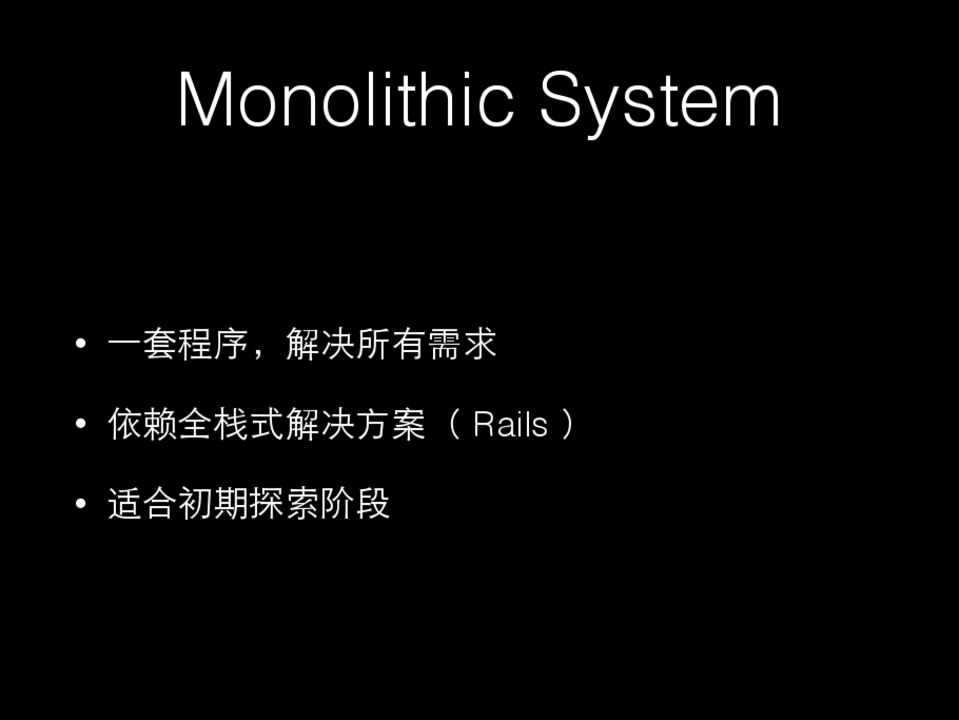 • ⼀一套程序,解决所有需求 • 依赖全栈式解决⽅方案( Rails ) • 适合初期探索阶段