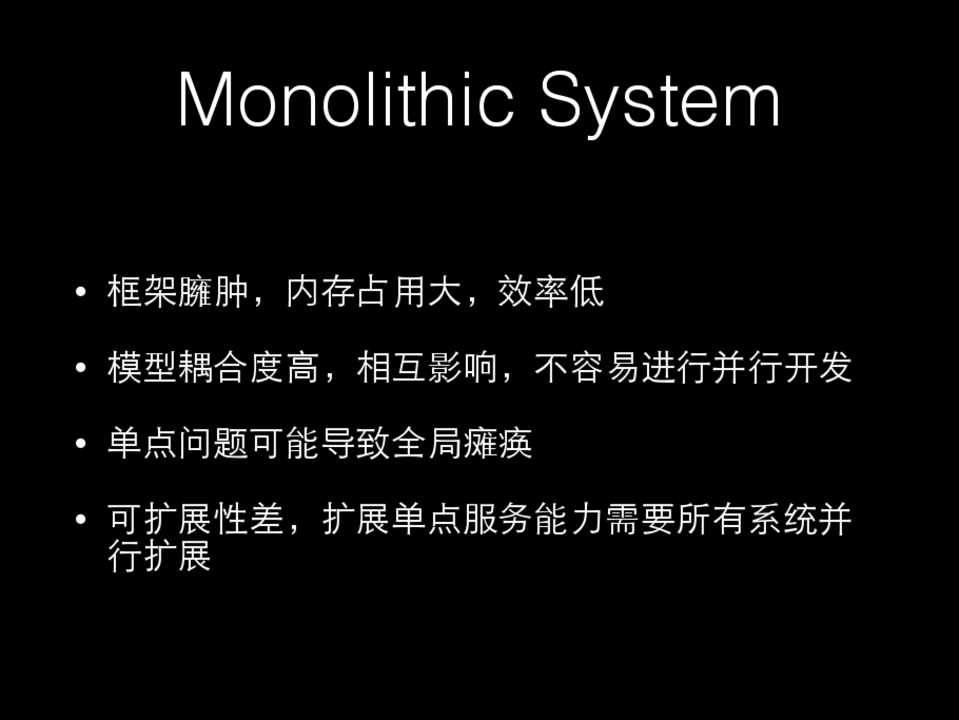 • 框架臃肿,内存占⽤用⼤大,效率低 • 模型耦合度⾼高,相互影响,不容易进⾏行并⾏行开发 • 单点问题可能导致全局瘫痪 • 可扩展性差,扩展单点服务能⼒力需要所有系统并