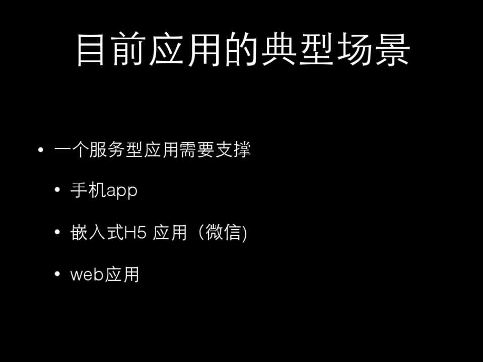 • ⼀一个服务型应⽤用需要⽀支撑 • ⼿手机app • 嵌⼊入式H5 应⽤用(微信) • web应⽤用