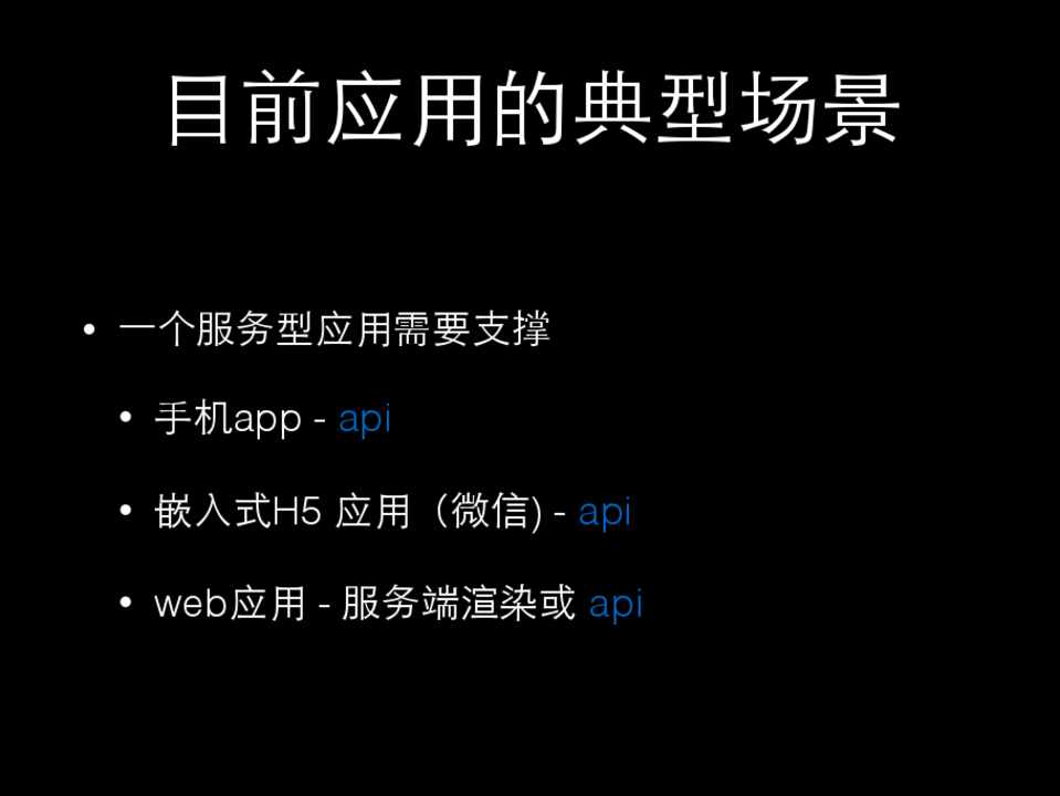 • ⼀一个服务型应⽤用需要⽀支撑 • ⼿手机app - api • 嵌⼊入式H5 应⽤用(微信) - api • web应⽤用 - 服务端渲染或 api