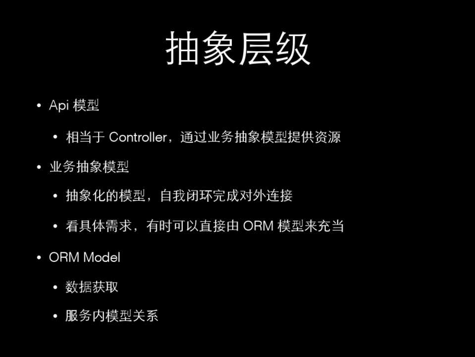 • 业务抽象模型 • 抽象化的模型,⾃自我闭环完成对外连接 • 看具体需求,有时可以直接由 ORM 模型来充当