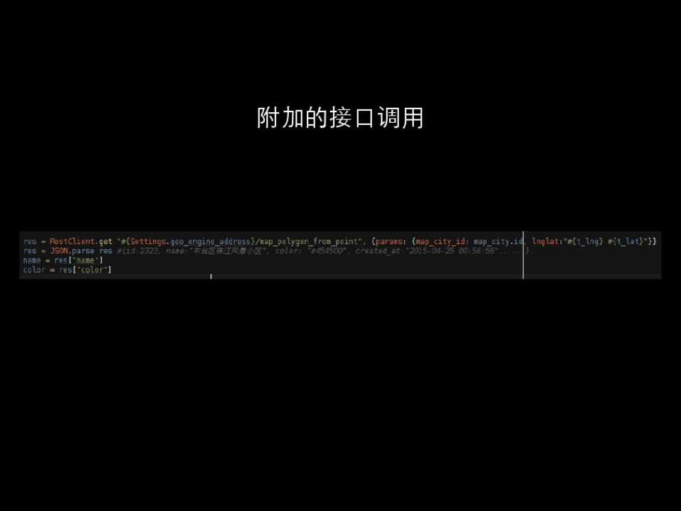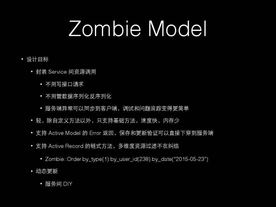 • 设计⺫⽬目标 • 封装 Service 间资源调⽤用 • 不⽤用写接⼝口请求 • 不⽤用管数据序列化反序列化 • 服务端异常可以同步到客户端,调试和问题追踪变得更简单 • 轻,除⾃自定义⽅方法以外,只⽀支持基础⽅方法,速度快,内存少 • ⽀支持 Active Model 的 Error 返回,保存和更新验证可以直接下穿到服务端 • ⽀支持 Active Record 的链式⽅方法,多维度资源过滤不在纠结 • Zombie::Order.by_type(1).by_user_id(238).by_date(“2015-05-23”) • 动态更新 • 服务间 DIY