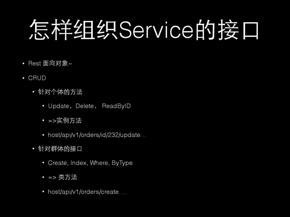 • 针对群体的接⼝口 • Create, Index, Where, ByType • => 类⽅方法 • host/api/v1/orders/create….