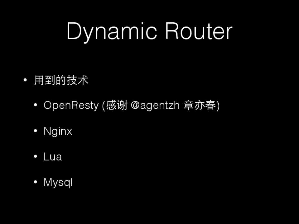 • ⽤用到的技术 • OpenResty (感谢 @agentzh 章亦春) • Nginx • Lua • Mysql