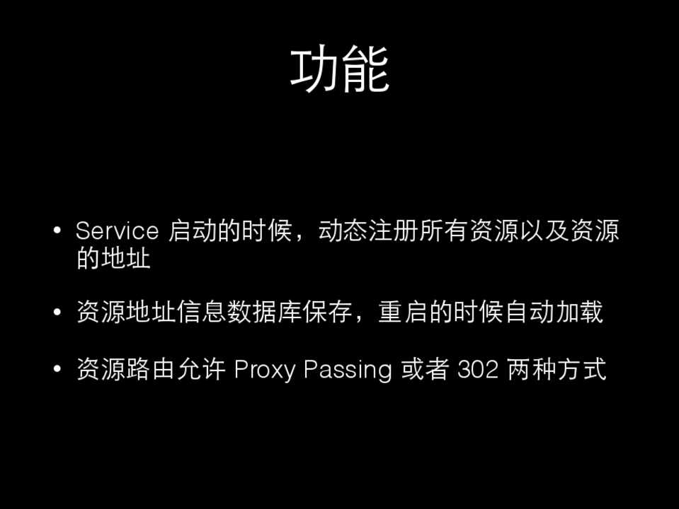 • 资源地址信息数据库保存,重启的时候⾃自动加载 • 资源路由允许 Proxy Passing 或者 302 两种⽅方式