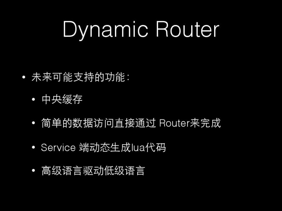 • 未来可能⽀支持的功能: • 中央缓存 • 简单的数据访问直接通过 Router来完成 • Service 端动态⽣生成lua代码 • ⾼高级语⾔言驱动低级语⾔言