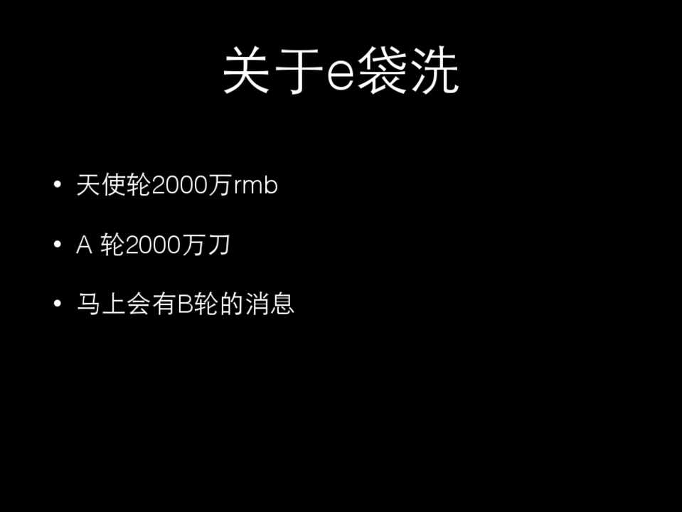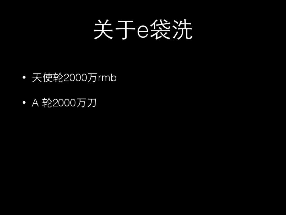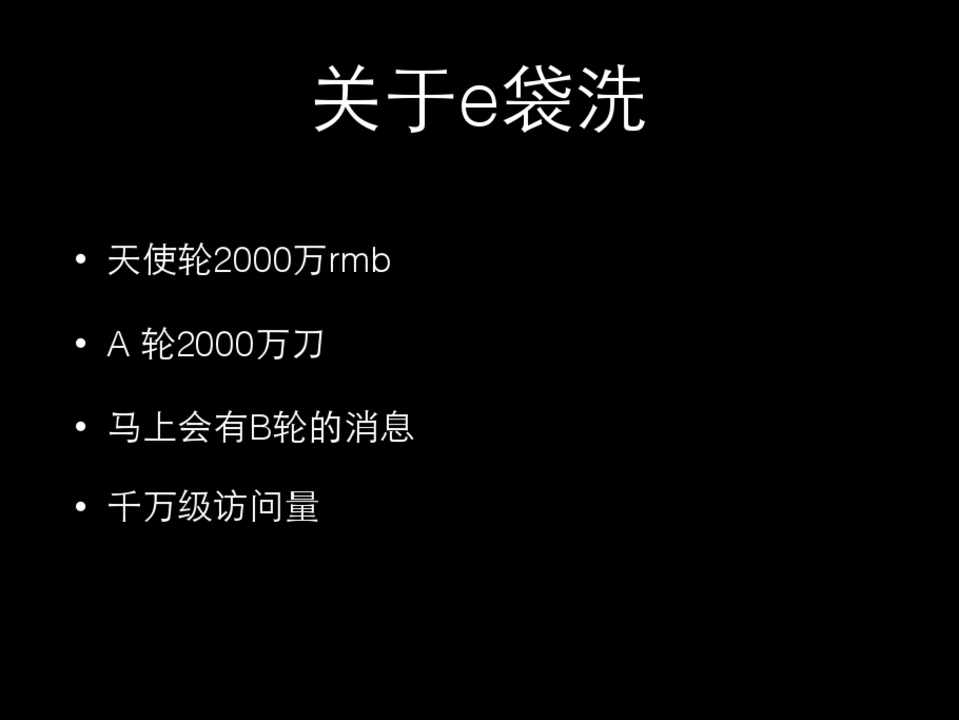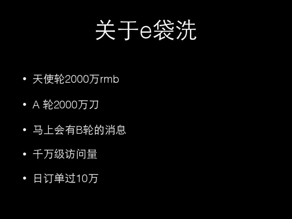 • 天使轮2000万rmb • A 轮2000万⼑刀 • ⻢马上会有B轮的消息 • 千万级访问量 • ⽇日订单过10万