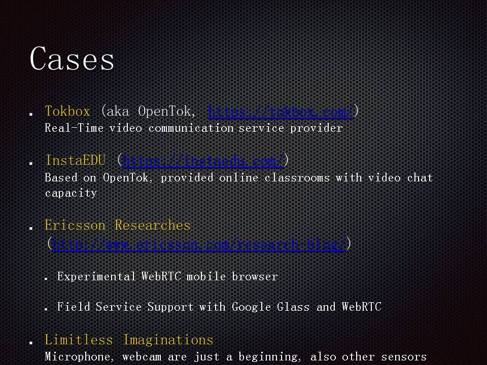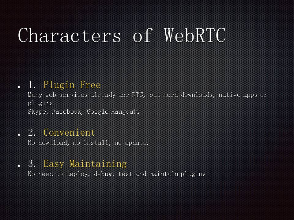 1. Plugin FreeMany web services already use RTC, but need downloads, native apps or plugins.Skype, Facebook, Google Hangouts